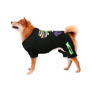Dress your pet in a spooky style for Halloween in this sweet Skeleton dress. The dress has a black jersey top with colorful screen print skeleton art and a three-tiered satin skirt in orange, green, and purple. Constructed in a pullover style for easy on and off! For cleaning care, hand wash cold and dry flat.